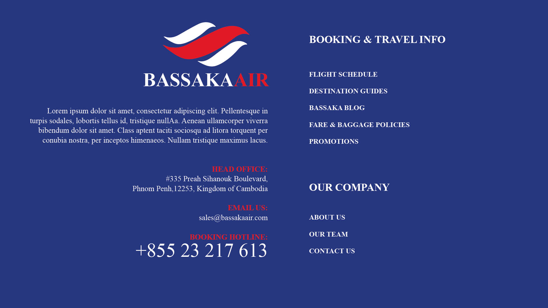 Website design concept for Bassaka Air, a local Cambodian airline flying to Phnom Penh, Siem Reap and regional destinations. I produced the concept website design and layout which was then coded by their team.
