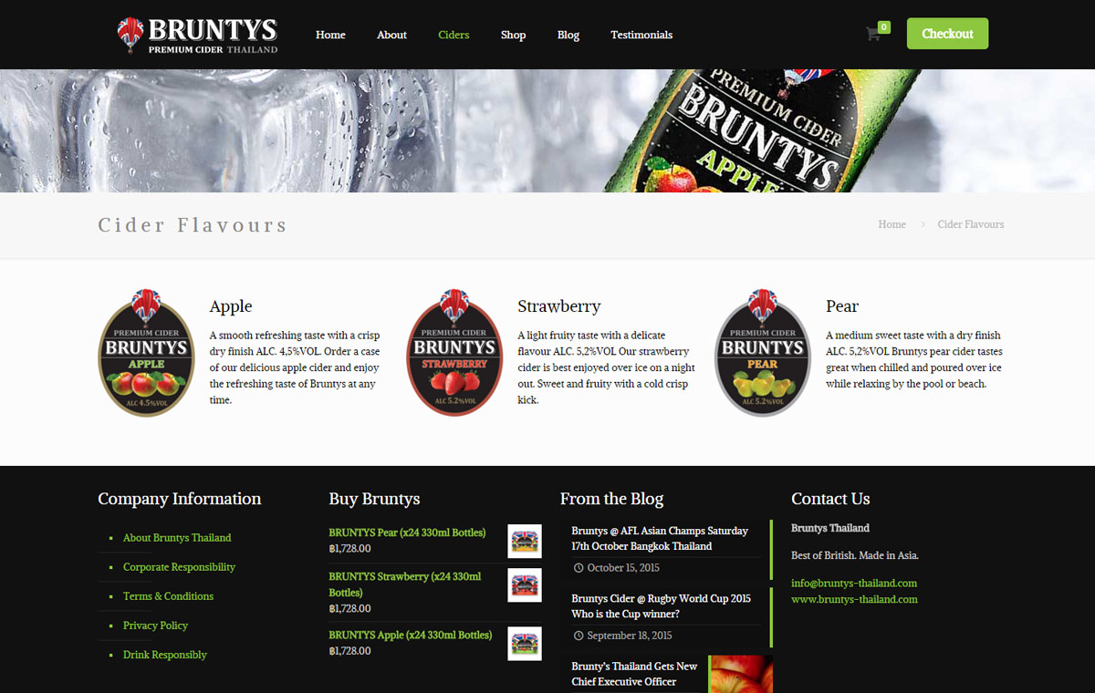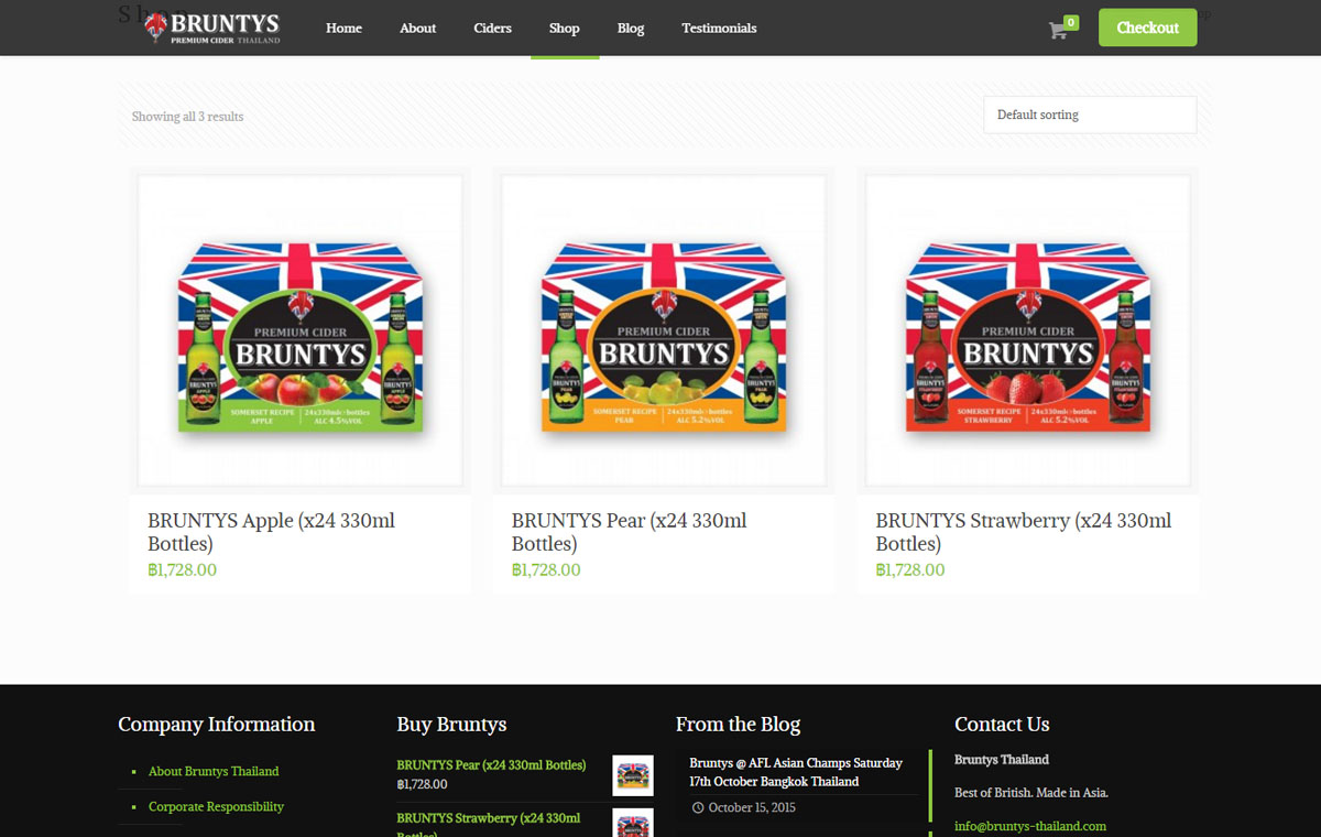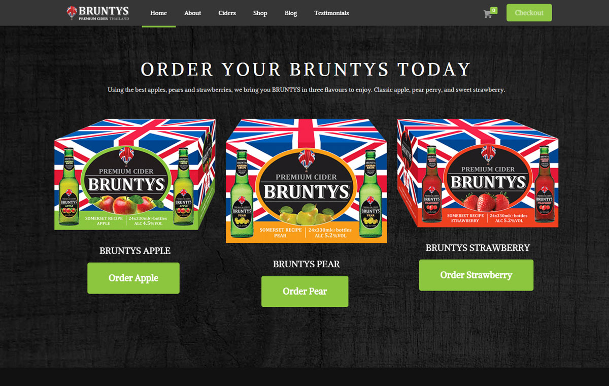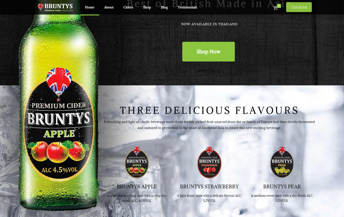 E-commerce website design using a WordPress based online shop. The responsive website for Bruntys in Thailand allows customers to easily access the information and order stock direct from the site through the shopping cart system.