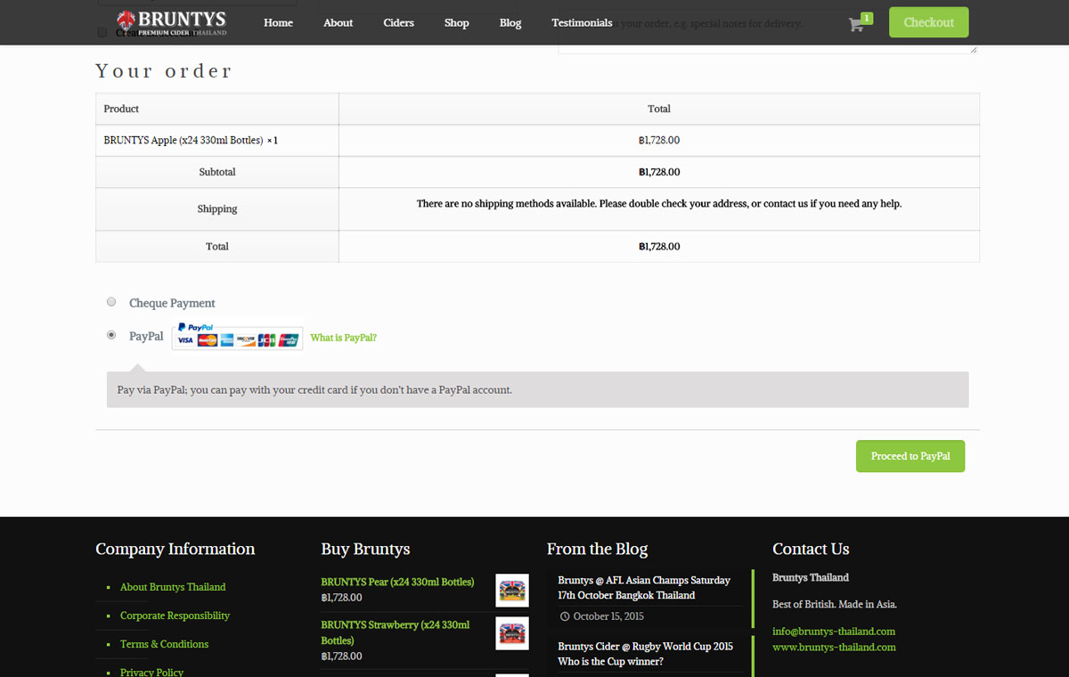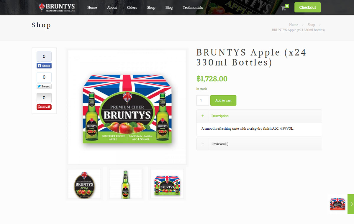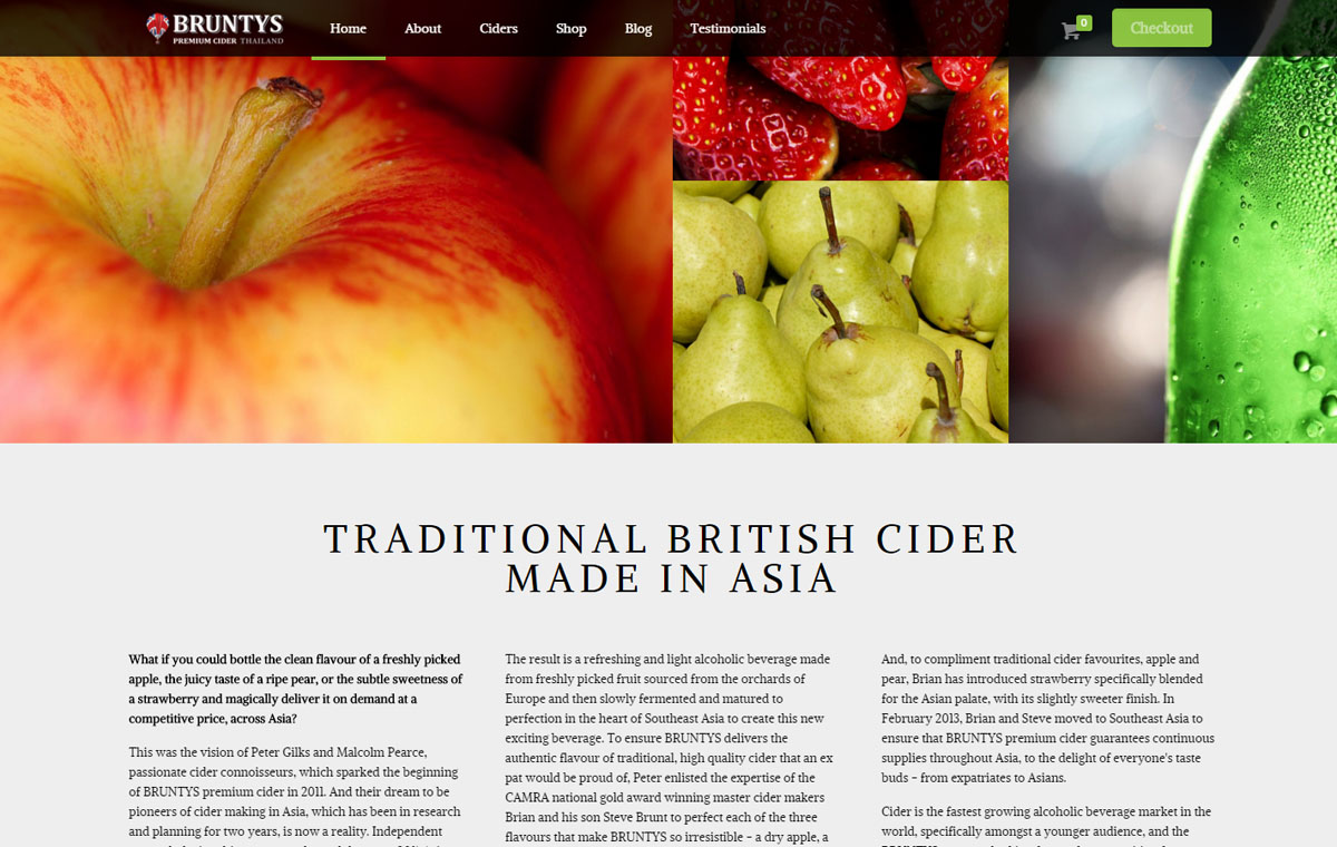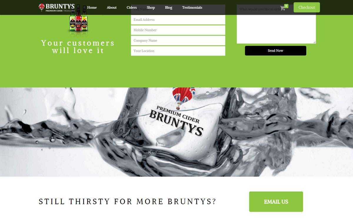 E-commerce website design using a WordPress based online shop. The responsive website for Bruntys in Thailand allows customers to easily access the information and order stock direct from the site through the shopping cart system.
