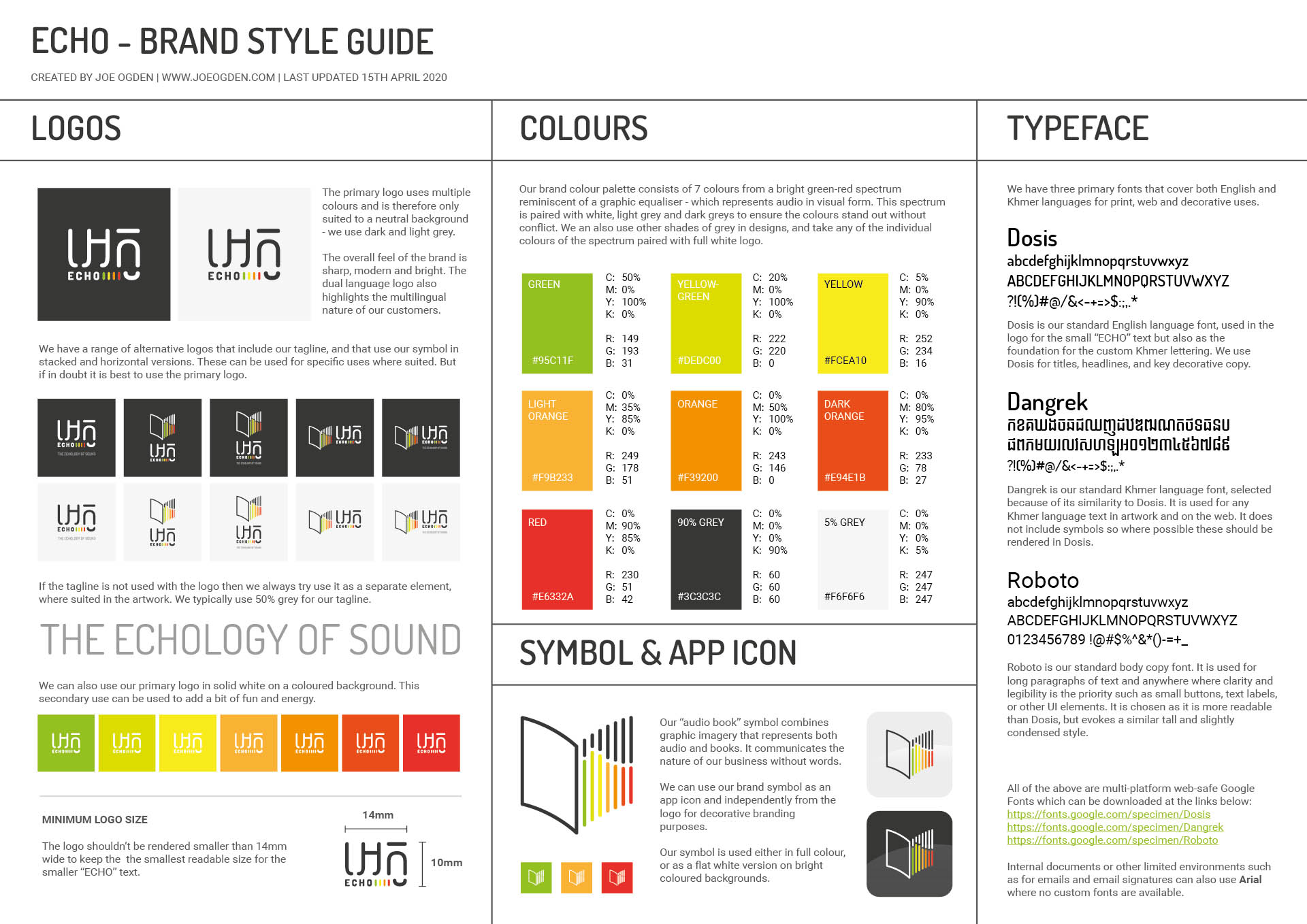 Echo is a new app startup focused around audiobooks to the Cambodian market. The brand is designed to convey the message of audio and books, with a techy feel. The unique multi-lingual logo is designed primarily in Khmer, with English as a secondary language. The translated Khmer word for “echo” closely follows the same pronunciation in English so works well in both languages. This logo and brand design project was an interesting challenge in creating a strong Khmer logo design.