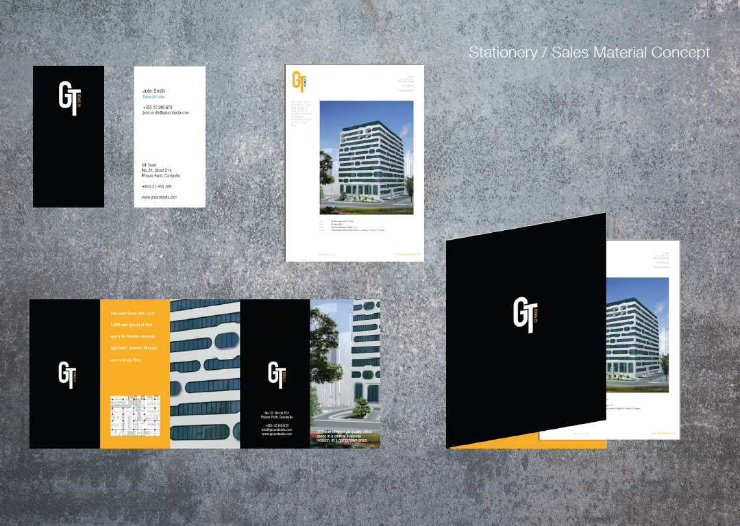 Logo, branding, corporate stationery, brochure design, and advertising for GT Tower Phnom Penh, an office building development, work conducted via Urban Design Studio in Phnom Penh, Cambodia.