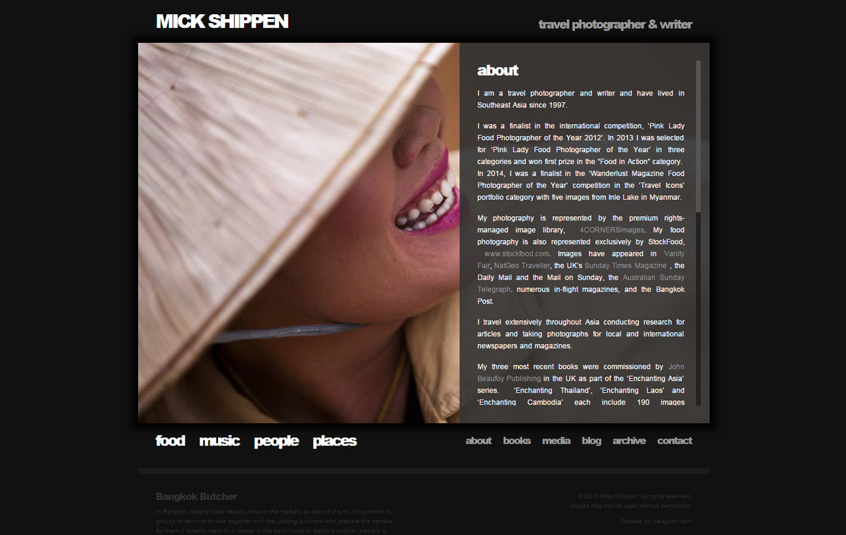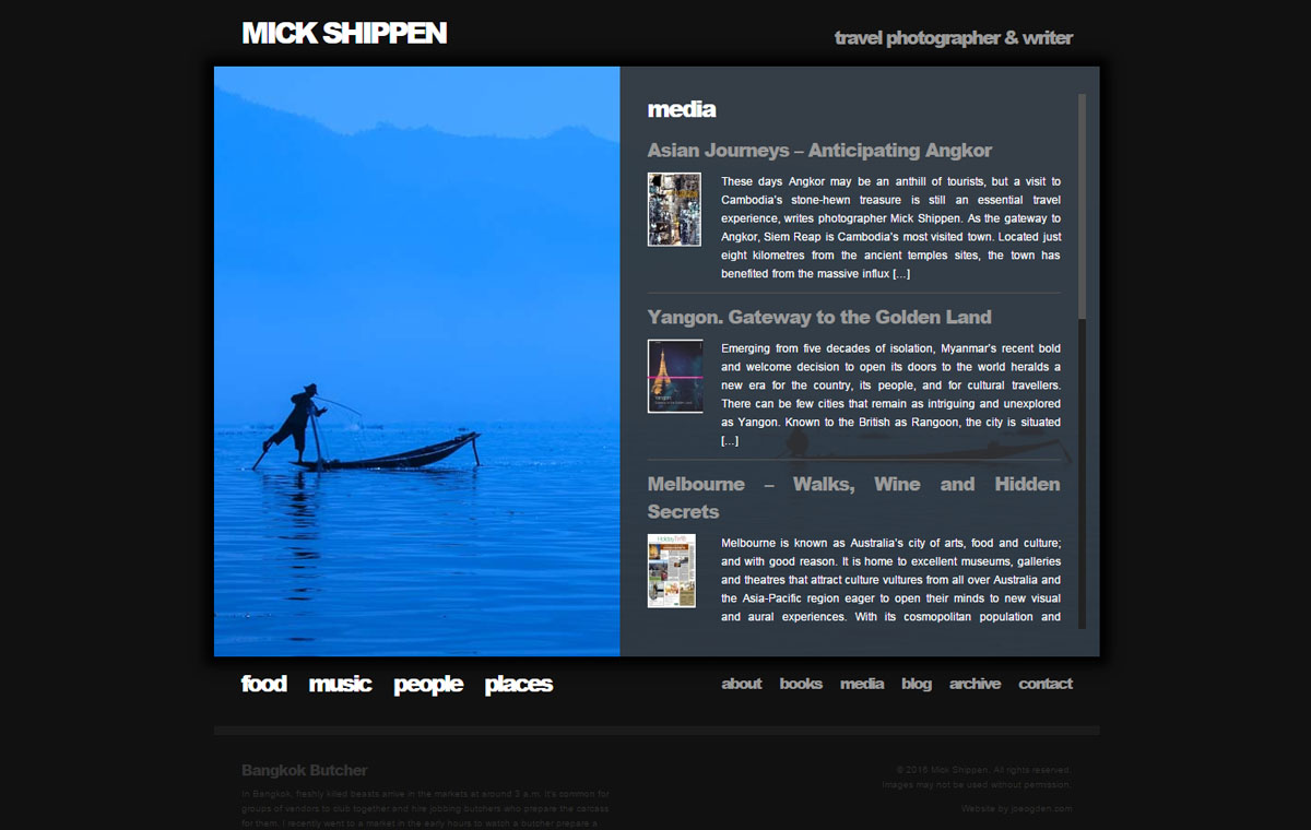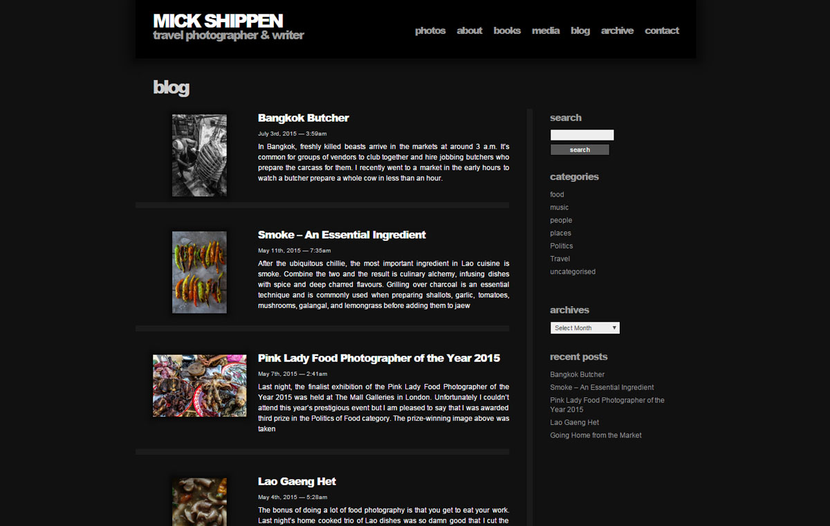 Custom photography website design for Mick Shippen, a freelance photographer and writer based in Thailand/Laos. Uses WordPress with a custom developed theme.