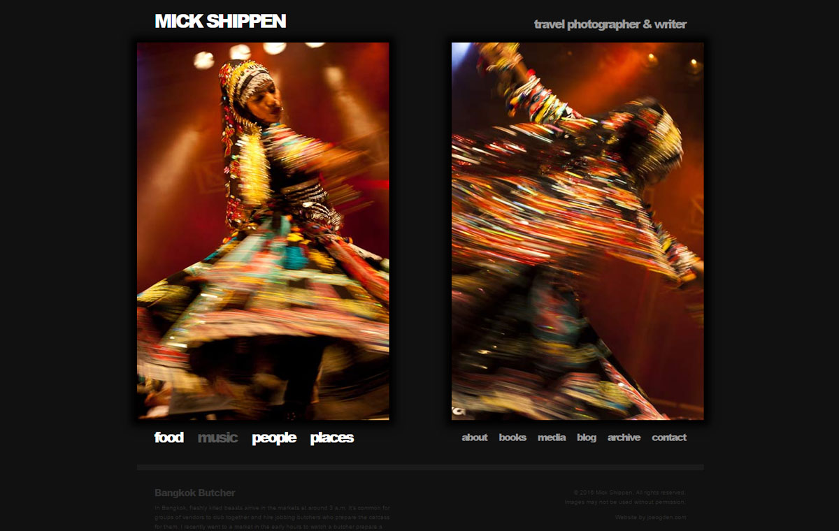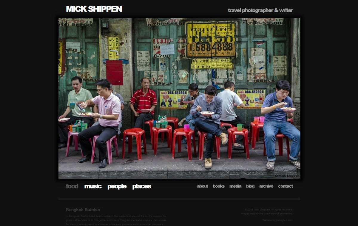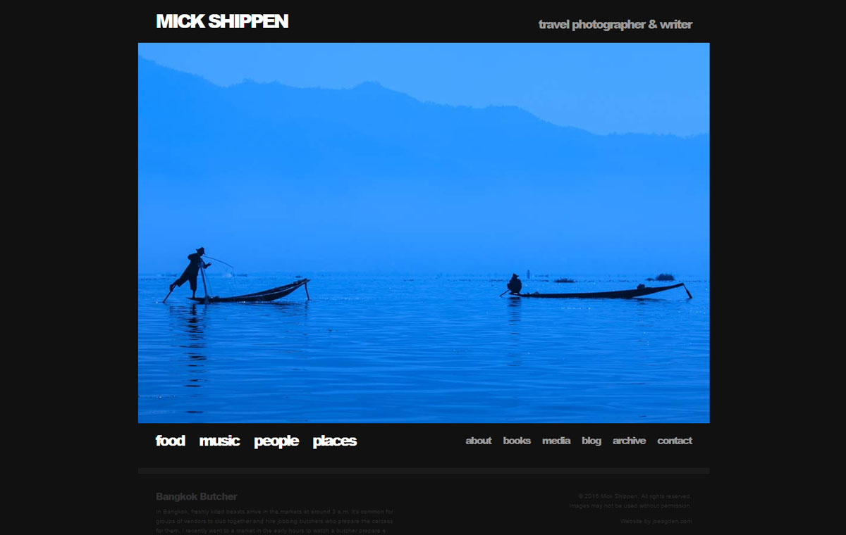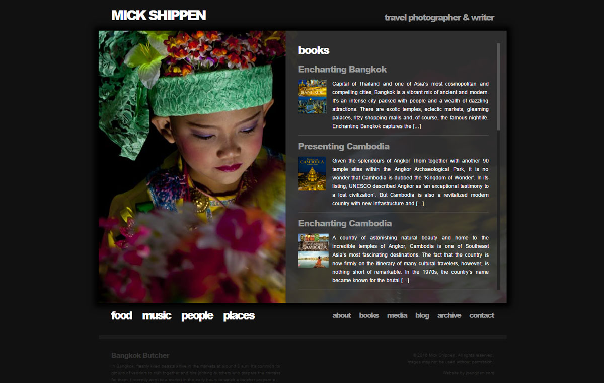 Custom photography website design for Mick Shippen, a freelance photographer and writer based in Thailand/Laos. Uses WordPress with a custom developed theme.