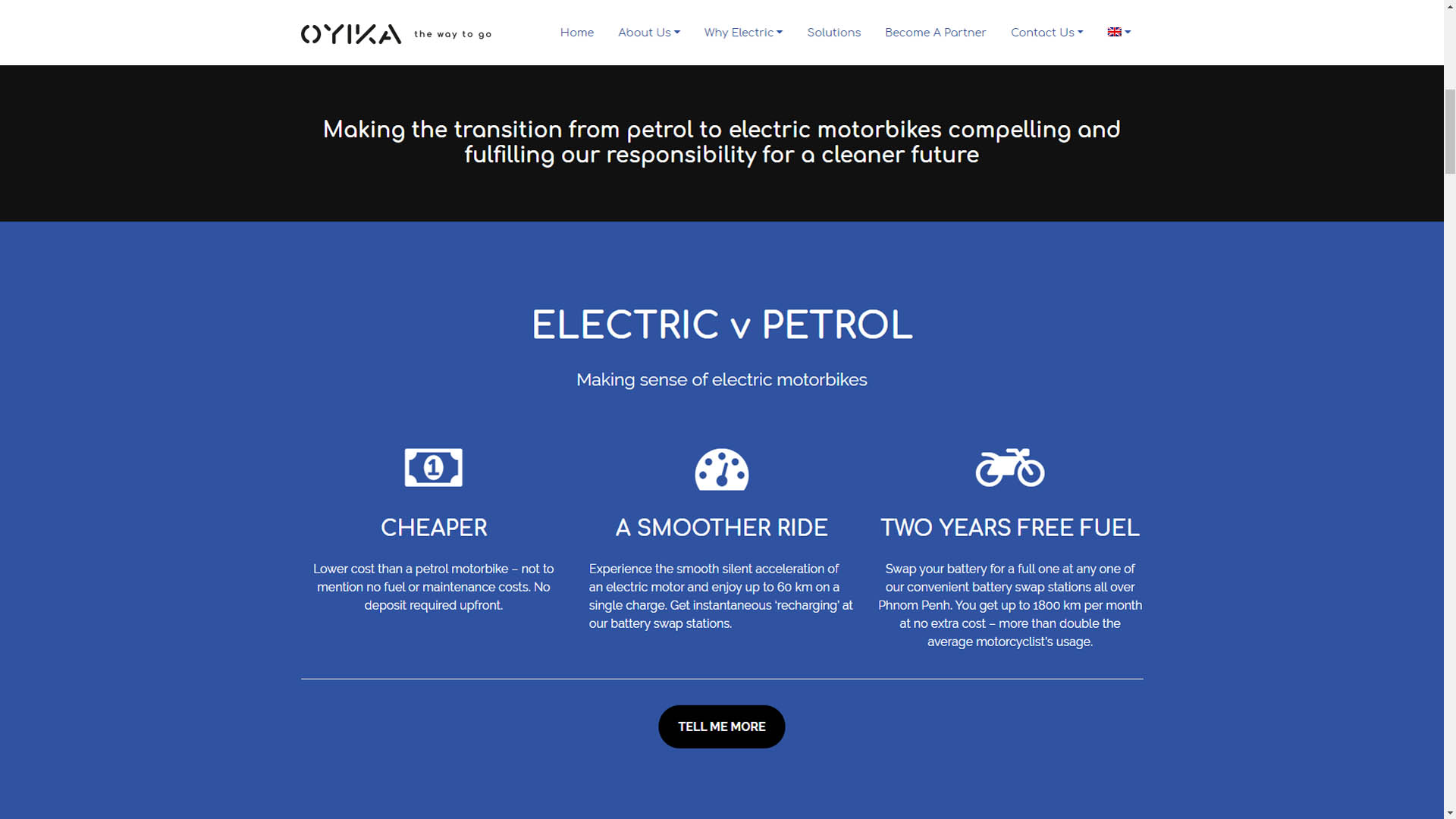 One page website design for the Oyika electric motorbike company. Oyika is a fast growing innovative startup launching in Cambodia, Vietnam, Indonesia. As part of the project I also helped finalise the brand identity, and shot the electric motorbike product photos.