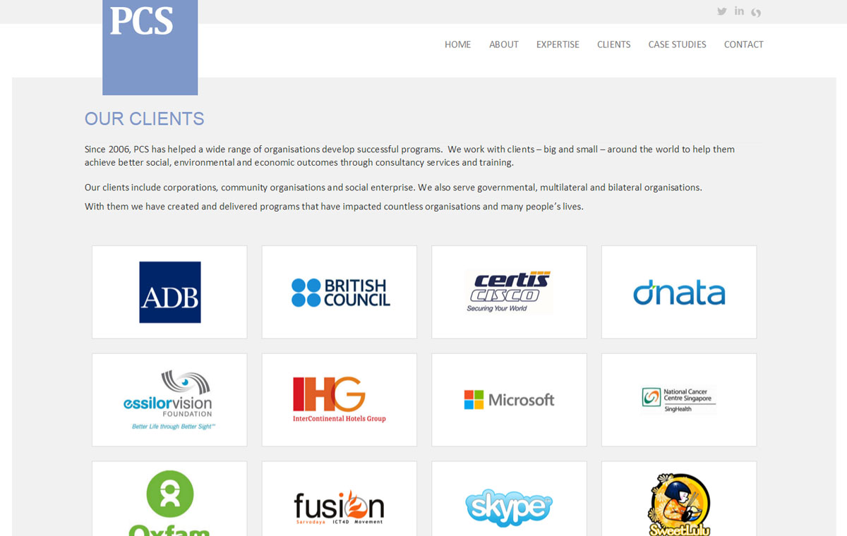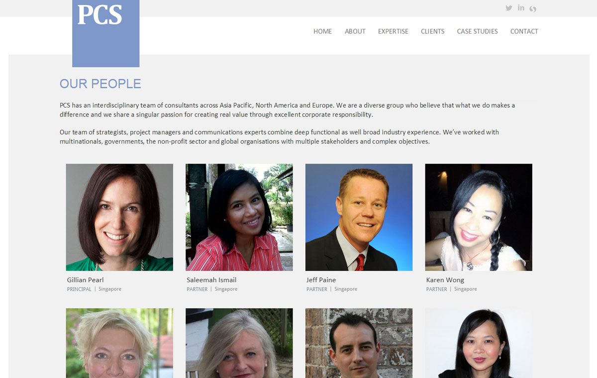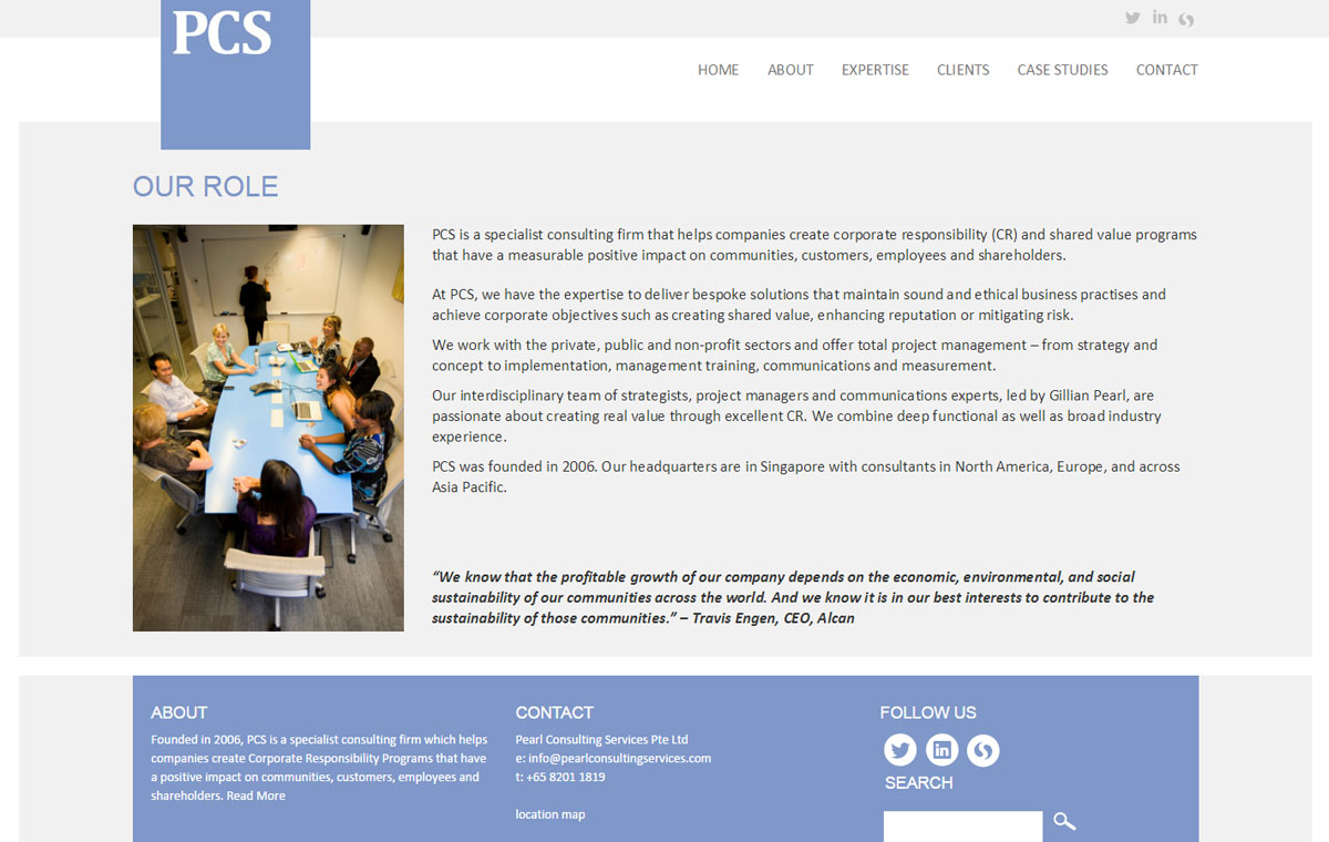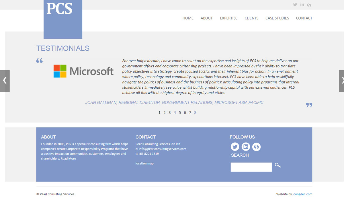 Website for Pearl Consulting Services in Singapore. Showcasing their services, team, selected clients and case studies.
