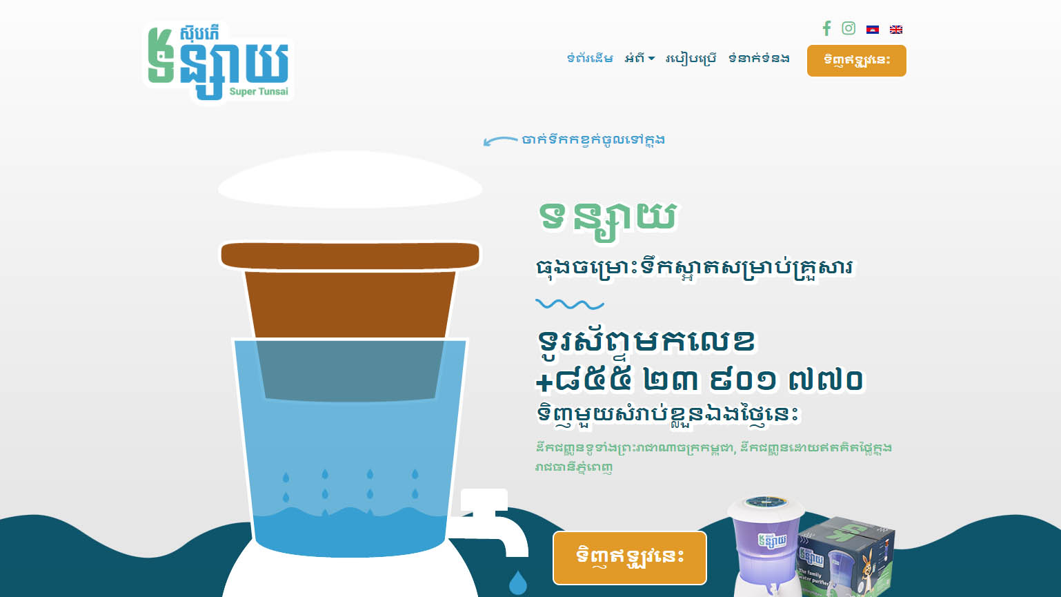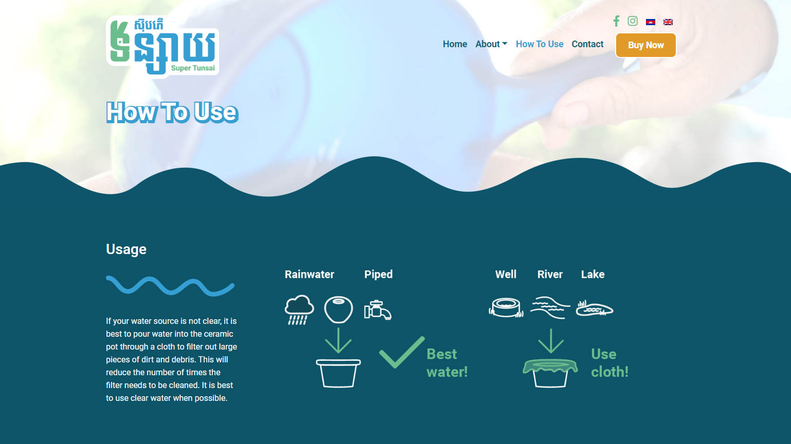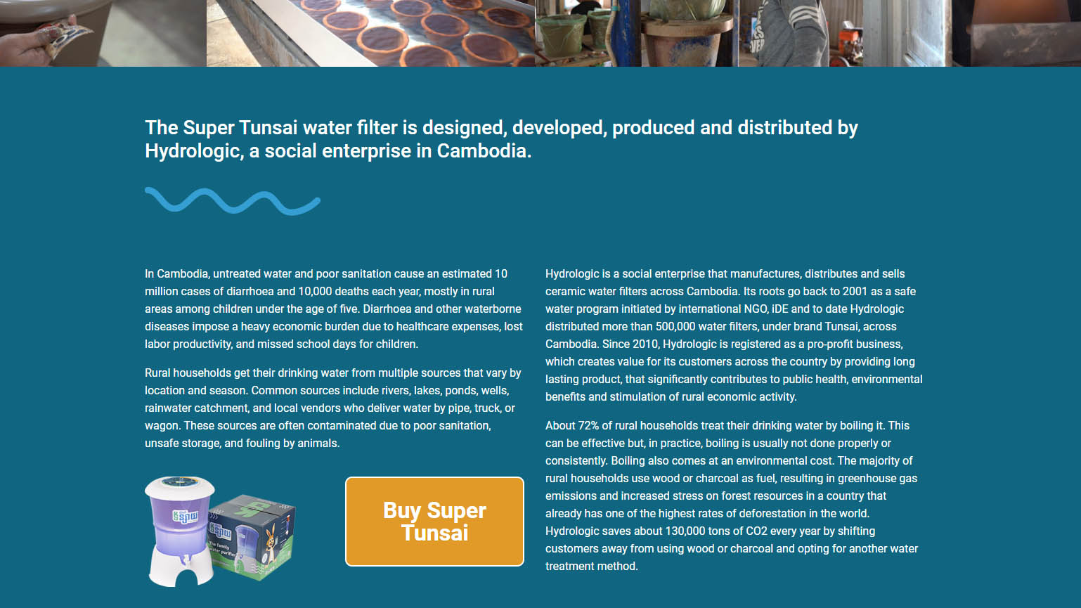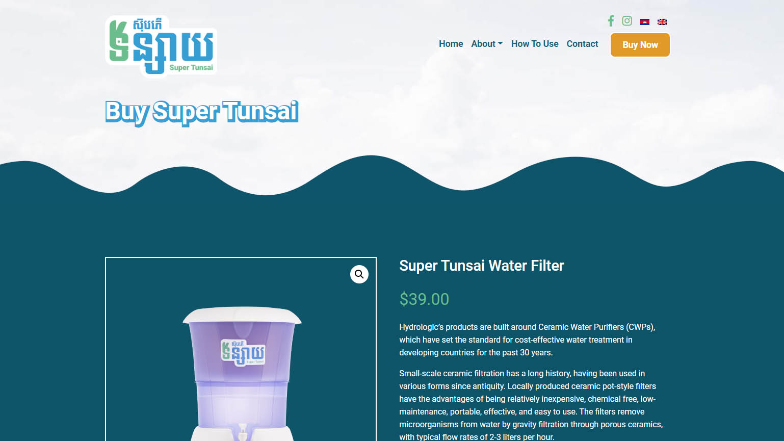 Super Tunsai is an innovative water filter product developed by Hydrologic NGO in Cambodia. I created an e-commerce website to help expand their sales directly to customers online as part of their digital marketing strategy that also includes heavy promotion on Facebook. The Super Tunsai website is fully multi-lingual in both Khmer and English, including the full shopping cart checkout process and all email communications. As part of the project I also designed updated packaging, stickers, and helped finalise the new brand identity. I also shot studio product photos of the water filter product which are used on the website.