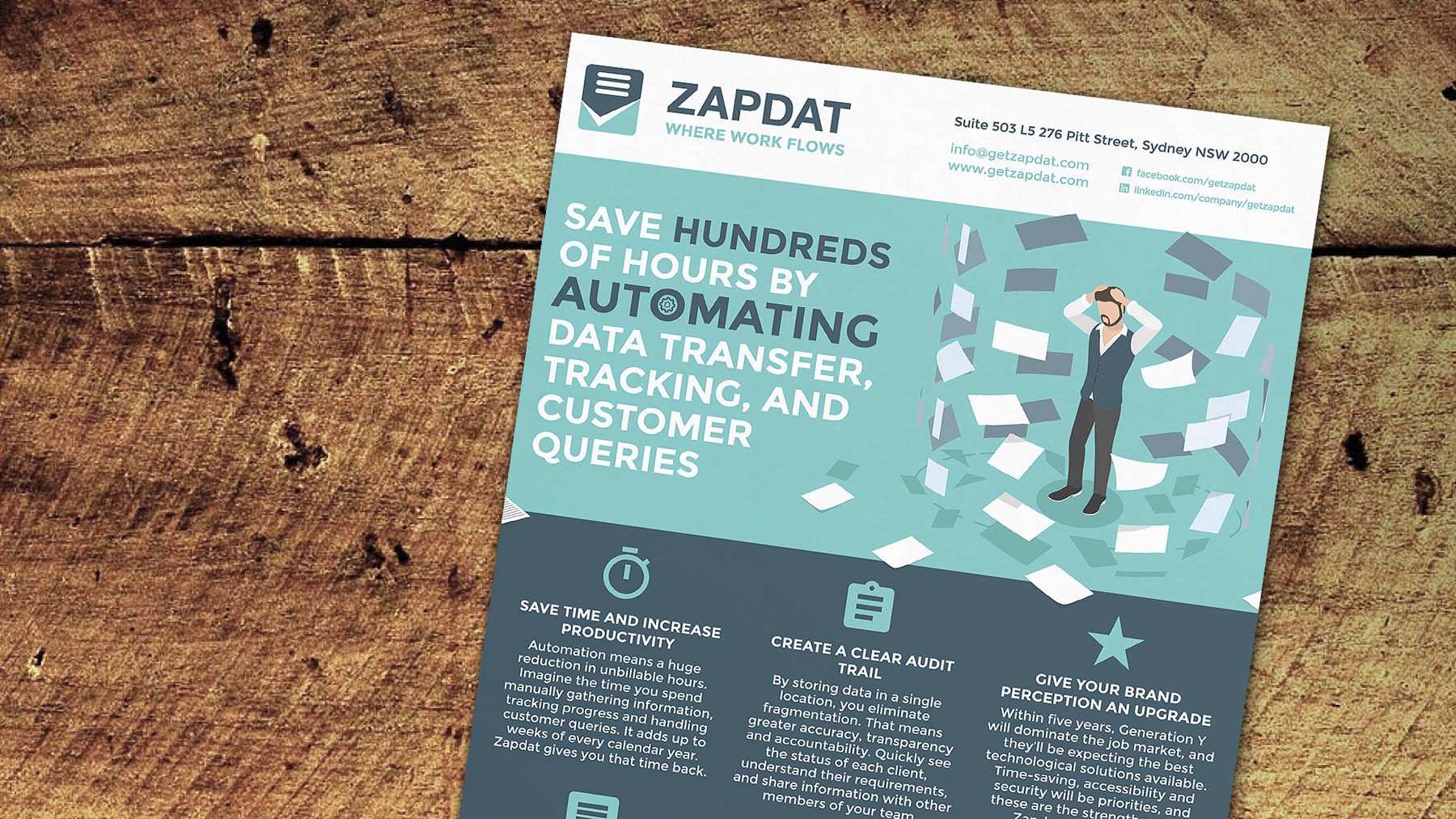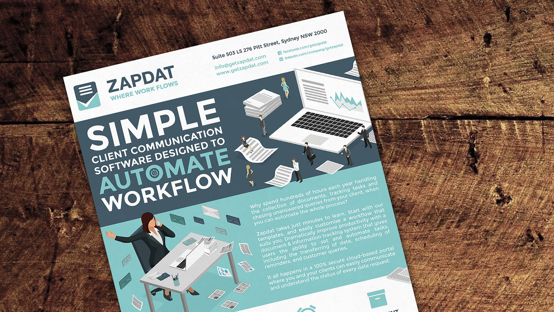 Brochure graphic design for Zapdat, an Australian web app startup that is building an automated platform for document collection and storage. I designed this double-sided A5 brochure/flyer to help them promote and market themselves locally in Sydney. The trendy isometric design uses graphics that can be reused in additional graphic design work for other advertising and marketing collateral.